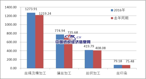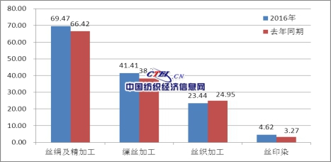 據(jù)國(guó)家統(tǒng)計(jì)局統(tǒng)計(jì),2016年全行業(yè)規(guī)模以上企業(yè)主營(yíng)業(yè)務(wù)收入1273.91億元,同比增長(zhǎng)4.48%;利潤(rùn)69.47億元,同比增長(zhǎng)4.59%,其中繅絲加工實(shí)現(xiàn)利潤(rùn)41.41億元,同比增長(zhǎng)8.39%,絲織加工實(shí)現(xiàn)利潤(rùn)23.44億元,同比下降6.05%,絲印染加工實(shí)現(xiàn)利潤(rùn)4.62億元,同比增長(zhǎng)41.34%??傮w來(lái)看,全行業(yè)主營(yíng)業(yè)務(wù)增速持續(xù)震蕩調(diào)整,下半年受生產(chǎn)要素成本上漲、出口下降等影響,行業(yè)利潤(rùn)增速出現(xiàn)了前高后低走勢(shì),全年利潤(rùn)增速較2015年回落了1.44個(gè)百分點(diǎn)。