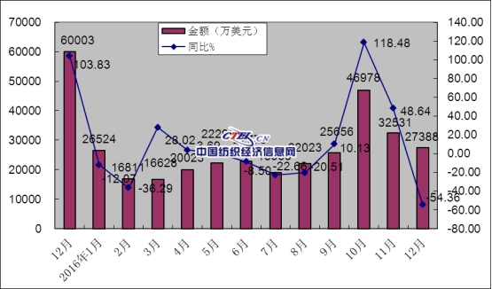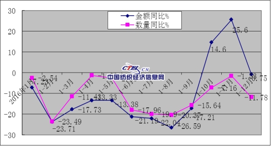 2016年真絲綢服裝出口數(shù)量、金額同比情況