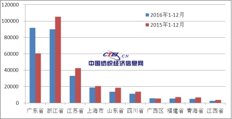 2016年,根據(jù)各省市真絲綢商品出口金額排名情況分析,出口排名前十的省份中絕大部分省(區(qū))都出現(xiàn)了不同程度地下滑,只有廣東、廣西同比有所增長(zhǎng)。浙江、江蘇、上海、山東、四川、福建、青海、江西,分別下降14.48%、21.92%、9.57%、27.38%、18.18%、22.72%、25.1%、29.37%。在各省市絲綢出口普降格局明顯的情況下,廣東省絲綢出口異軍突起,出現(xiàn)了同比51.6%的大幅增長(zhǎng),成為2016年國(guó)內(nèi)絲綢外貿(mào)出口最大的亮點(diǎn)。