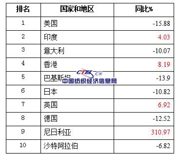 2016年,國(guó)內(nèi)真絲綢商品對(duì)前十位傳統(tǒng)主銷市場(chǎng)出口有降有升。其中,對(duì)美國(guó)、意大利、巴基斯坦、日本、德國(guó)、沙特阿拉伯等六個(gè)國(guó)家出口金額有不同程度減少;對(duì)印度、香港、英國(guó)、尼日利亞等國(guó)家和地區(qū)有所增長(zhǎng)。整體呈現(xiàn)降多增少低迷格局。