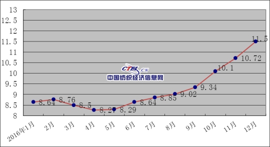 2016年1-12月3A級(jí)生絲價(jià)格走勢(shì)圖(價(jià)格:萬(wàn)元/噸)