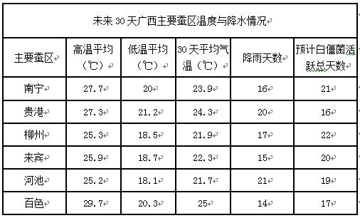 從廣西天氣預(yù)報(bào)網(wǎng)查詢到南寧、貴港、柳州、來賓、河池、百色六大蠶區(qū)未來30天的平均氣溫在22-25℃左右,雨水偏多,潮濕溫潤仍是常態(tài),蠶室溫度基本上在20-27℃左右,是桑蠶白僵病發(fā)生的最適溫濕度,如果不加強(qiáng)防范,白僵病或會(huì)暴發(fā)流行;綜合以上信息,建議小蠶共育戶及廣大蠶農(nóng)及時(shí)采取防范措施,預(yù)防蠶病的發(fā)生。