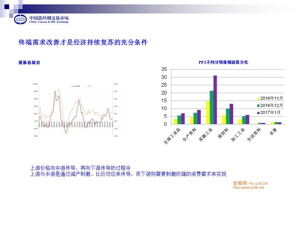 我們絲綢也是如此,上游蠶繭價格通過繭站、絲廠向中游綢廠傳導(dǎo)、再向下游服裝、家紡、國外客戶等終端傳導(dǎo)的過程中,上游與中游是通過減產(chǎn)刺激、比價效應(yīng)來傳導(dǎo),而下游則需要刺激終端的消費需求來實現(xiàn)。