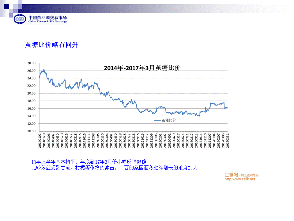 由于去年蠶繭收購價一路上漲,全年漲幅達(dá)到32.8%,高于甘蔗的漲幅,這樣廣西有望保持已有的桑園面積,不存在減產(chǎn)的因素,但想要繼續(xù)增長的難度將 加大。