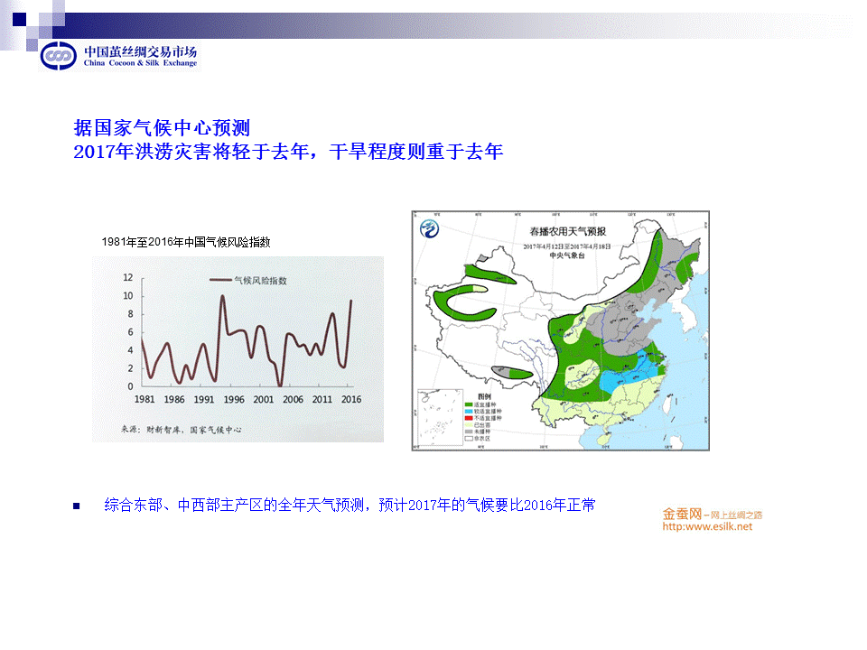 去年繭絲價格的上漲,與氣候異常分不開的,今年據(jù)國家氣候中心預(yù)測,洪澇災(zāi)害將輕于去年,干旱程度則重于去年。我們從1981年至2016年中國氣候風(fēng)險指數(shù)圖上可以看出,平均值為4.19,過去的2016年接近10,是35年來的次高位。