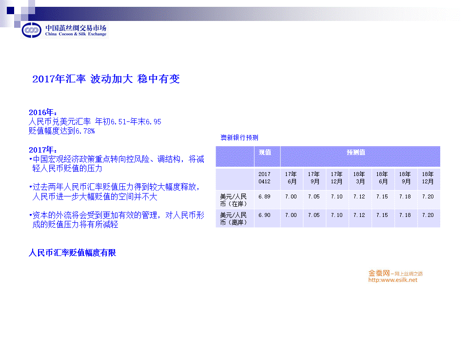 但在美國加息、美元升值的背景下,以及特朗普經(jīng)濟(jì)政策的不確定性和歐美政治動蕩的不確定性,因此,17年人民幣兌美元匯率也可能出現(xiàn)一定時期內(nèi)以一定幅度的震蕩,我們可以看一下澳新銀行的預(yù)測,那么,這樣意味著17年的絲綢出口將會變得比16年要艱難。