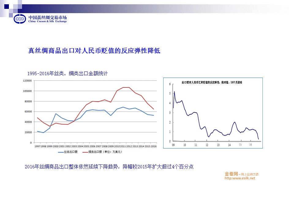 絲綢出口,2009-2010年后,由于全球貿(mào)易需求的下降,出口企業(yè)只能通過更大的價格降幅來支撐出口,特別是在16年繭絲價格上漲了30%以上,已經(jīng)抵消了人民幣對外貶值的幅度。而且,對于歐洲市場,人民幣對歐元只貶值了2.98%。