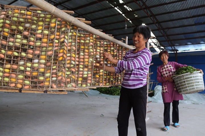 17日,舟山海燕綠絲家庭農(nóng)場內(nèi)工人正檢查彩色蠶的結(jié)繭情況。海燕農(nóng)場作為浙江大學(xué)和省農(nóng)業(yè)廳的示范點,是飼養(yǎng)彩色蠶的基地之一。由于彩色蠶吐出的絲天然帶有顏色,無需后續(xù)人工染色,目前養(yǎng)有春蠶30張。
