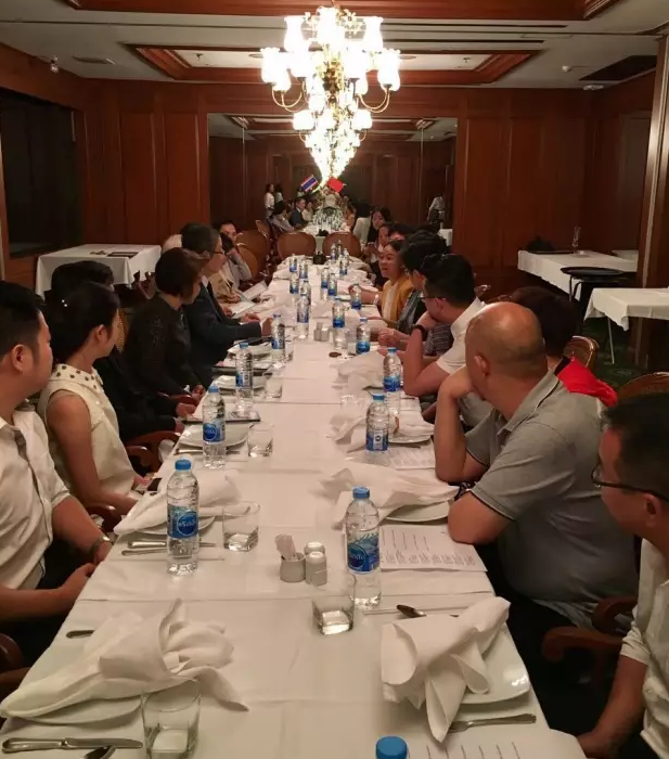 晚宴的地方是一個豪華的會所,在這里我們見到了泰國絲綢協(xié)會的十三位理事單位的代表,surin會長表示:在泰國,游客很喜歡帶著他們的泰絲回到自己的國家,而泰國的人也很喜歡帶著中國的絲綢回到泰國,在面臨如此巨大的旅游市場下,希望能通過此次的晚宴讓兩國的絲綢人相聚一堂,在未來的時間里可以有合作的機(jī)會,共同開拓國際的市場。