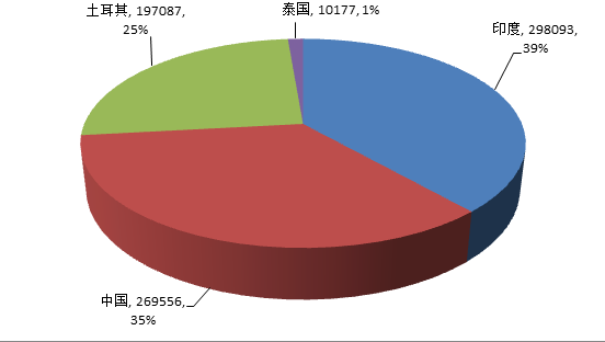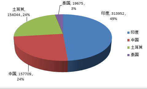 從真絲綢服裝及制品凈出口金額看,印度、中國(guó)、土耳其、泰國(guó)位居前四位。印度是全球真絲綢服裝及制品最大的賣家,中國(guó)居第二位。