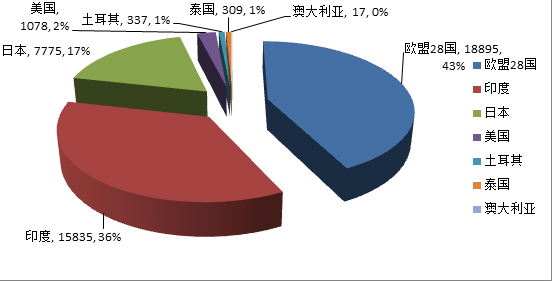 根據(jù)中國(guó)紡織品進(jìn)出口商會(huì)統(tǒng)計(jì),全球絲綢主要貿(mào)易國(guó)家/地區(qū)(中國(guó)、美國(guó)、日本、印度、土耳其、巴西、馬來(lái)西亞、澳大利亞、泰國(guó)和歐盟28國(guó))貿(mào)易總額為300.82億美元,同比下降2.6%。其中,出口額為146.85億美元,同比下降4.7%;進(jìn)口額為153.96億美元,同比下降0.5%。詳見(jiàn)下表: