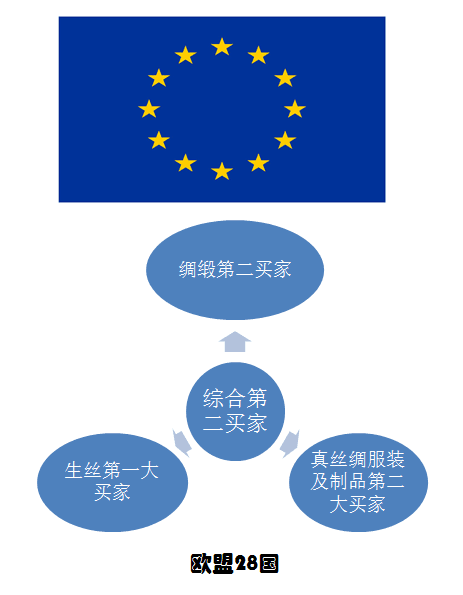 從生絲凈買金額看,歐盟28國(guó)、印度、日本分別以43%、36%、17%的份額位居前三位,可見(jiàn)歐盟28國(guó)才是是全球生絲最大的買家。