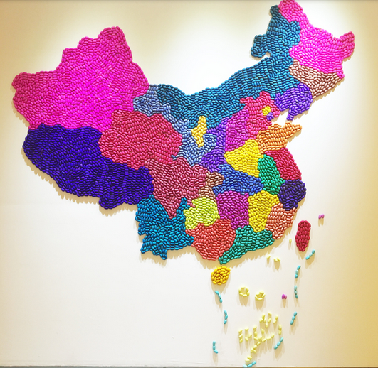 據(jù)悉,在這個地圖里,除了黃色蠶繭為天然蠶繭以外,其余的均為白色蠶繭染色而成。整個制作過程歷時20余天,經(jīng)歷了挑繭、剝繭、定顏色、打底、染色、粘制等程序,最終呈現(xiàn)出這樣一個有特殊風格的作品。