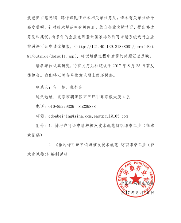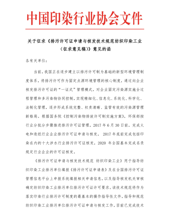 中國(guó)印染行業(yè)協(xié)會(huì)關(guān)于征求《排污許可證申請(qǐng)與核發(fā)技術(shù)規(guī)范 紡織印染工業(yè)》意見(jiàn)的函