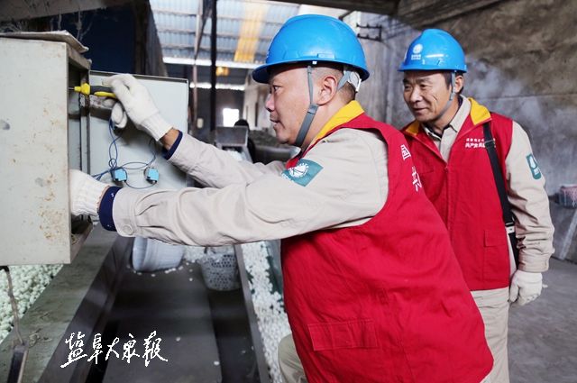 △東臺供電公司共產(chǎn)黨員服務(wù)隊在富南繭站檢查蠶繭烘干機控制箱。