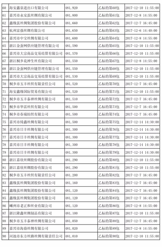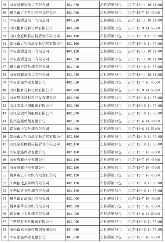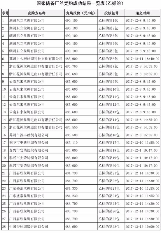 按照《商務(wù)部關(guān)于投放國(guó)家儲(chǔ)備廠絲的公告》(商務(wù)部公告[2017]第79號(hào))要求,2017年12月15日,國(guó)家繭絲綢辦在中機(jī)國(guó)際招標(biāo)有限公司舉行了國(guó)家儲(chǔ)備廠絲投放報(bào)價(jià)開(kāi)啟及評(píng)審會(huì)。現(xiàn)將結(jié)果公布如下: