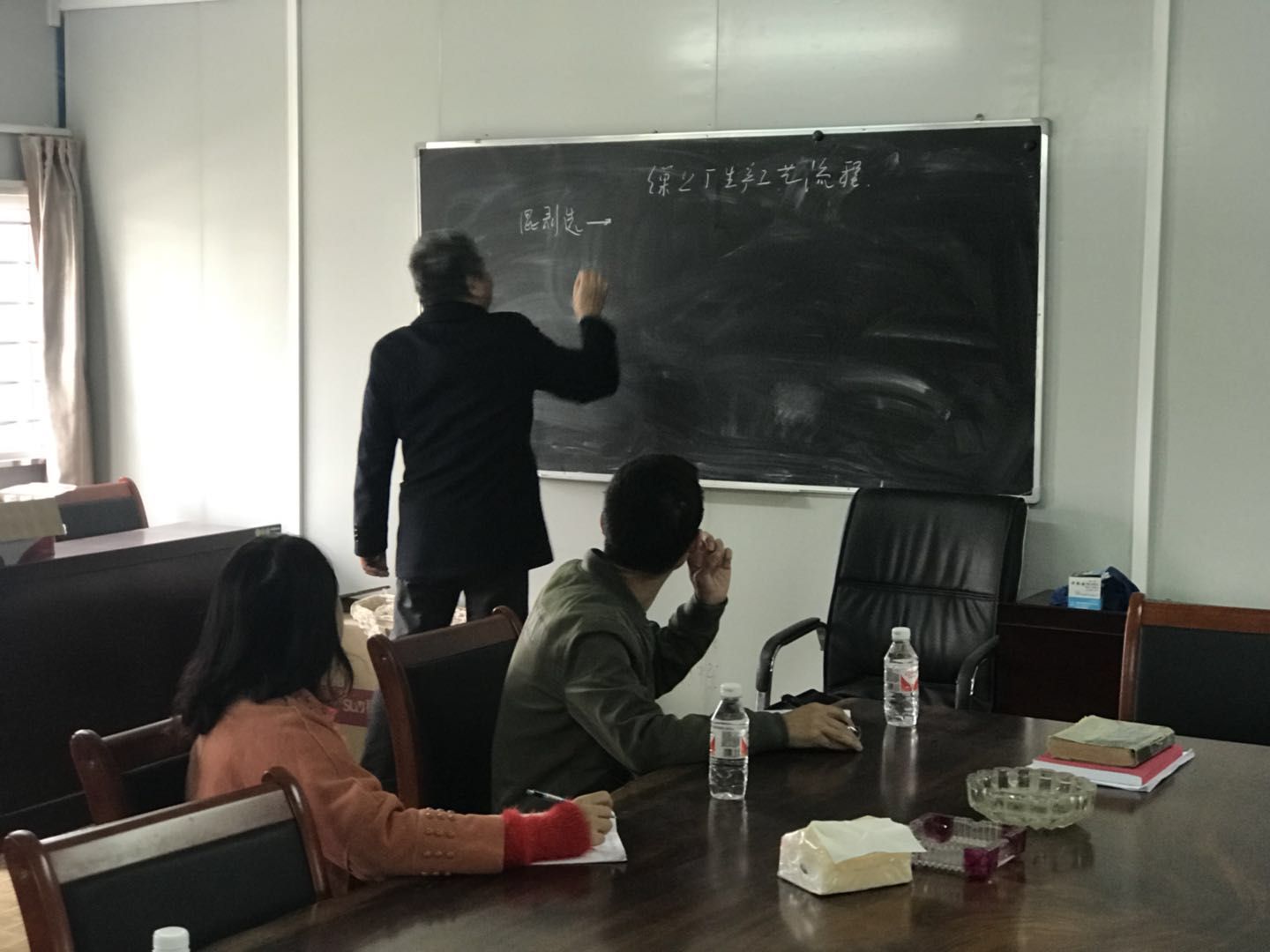 廣辦的員工們聽得都非常認(rèn)真,并且不忘做筆記。上好理論課后,龔廠長(zhǎng)帶領(lǐng)大家去生產(chǎn)車間實(shí)地參觀了生絲的生產(chǎn)工藝流程,讓大家更加直觀地了解。