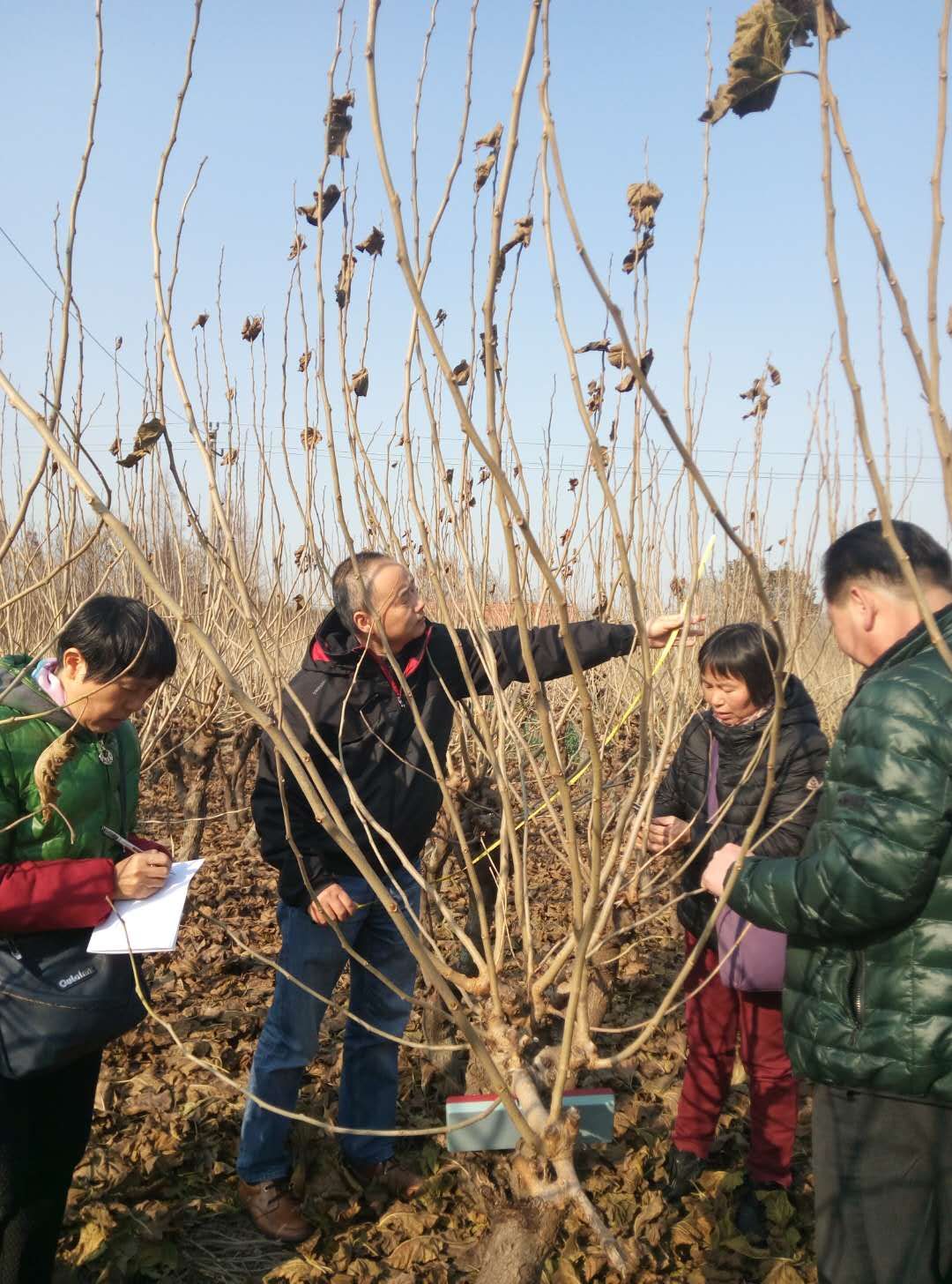 圖為秀洲區(qū)的蠶桑技術(shù)人員正在調(diào)查桑樹條長、芽數(shù)與桑條粗壯度(直徑)