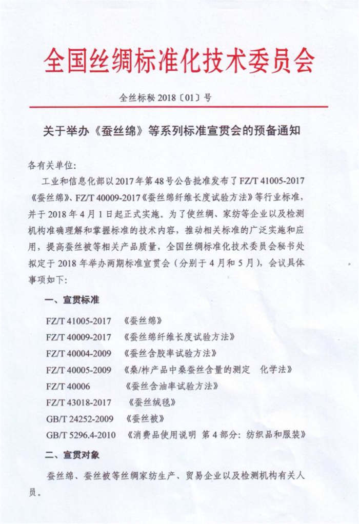 工業(yè)和信息化部以2017年第48號(hào)公告批準(zhǔn)發(fā)布了FZT41005-2017《蠶絲綿》、FZT40009-2017《蠶絲綿纖維長(zhǎng)度試驗(yàn)方法》等行業(yè)標(biāo)準(zhǔn),并于2018年4月1日起正式實(shí)施。為了使絲綢、家紡等企業(yè)以及檢測(cè)機(jī)構(gòu)準(zhǔn)確理解和掌握標(biāo)準(zhǔn)的技術(shù)內(nèi)容,推動(dòng)相關(guān)標(biāo)準(zhǔn)的廣泛實(shí)施和應(yīng)用,提高蠶絲被等相關(guān)產(chǎn)品質(zhì)量, 全國(guó)絲綢標(biāo)準(zhǔn)化技術(shù)委員會(huì)、浙江省絲綢協(xié)會(huì)定于2018年舉辦兩期標(biāo)準(zhǔn)宣貫會(huì)(分別于4月和5月在浙江省嘉興市和四川省南充市舉行),將宣貫《蠶絲綿》等系列標(biāo)準(zhǔn):