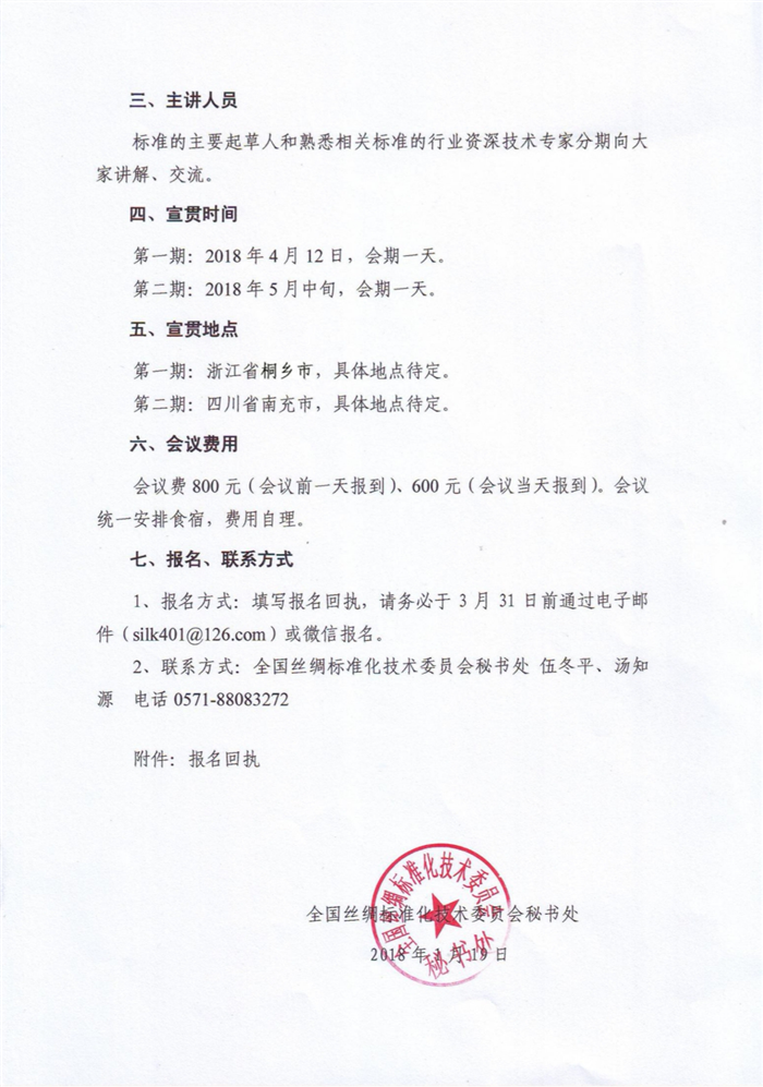 2、聯(lián)系方式:全國(guó)絲綢標(biāo)準(zhǔn)化技術(shù)委員會(huì)秘書處伍冬平、湯知源電話0571-88083272