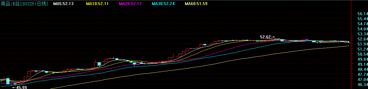 今日(周五)中國(guó)繭絲綢交易市場(chǎng)生絲指數(shù)微漲0.05%報(bào)收于5079.19點(diǎn)。B絲(3A級(jí)生絲):180325(合同約定的交收日)跌300報(bào)52.02萬(wàn),,180925(合同約定的交收日)跌600報(bào)49.74萬(wàn)。