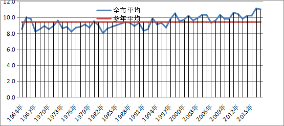 1964~2017年全市冬季(12-2月)平均氣溫演變曲線