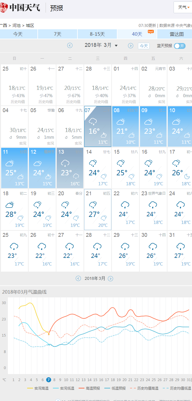 下圖為中國天氣網對河池市今年3月的天氣預報。預報顯示,氣溫較高,雨天較多,蠶農應及時整理溝渠,以利排灌促進桑樹生長,減輕病蟲危害。