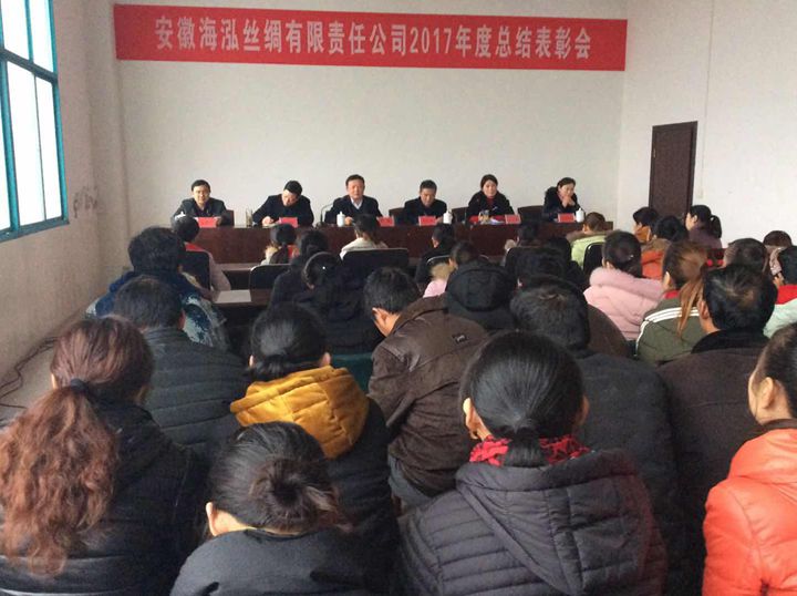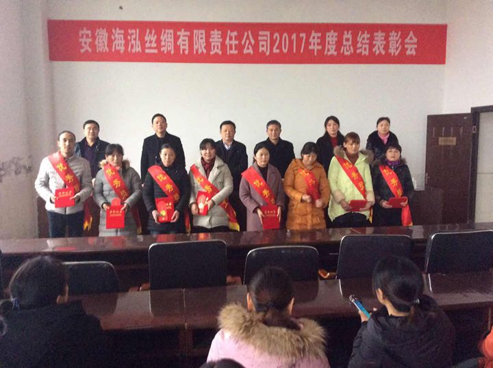 2018年1月23日,安徽海泓絲綢有限責(zé)任公司2017年度總結(jié)表彰會(huì)在海泓公司會(huì)議室舉行,會(huì)議由海泓公司總經(jīng)理朱啟蓮主持,總經(jīng)理助理夏學(xué)江宣讀了公司表彰決定,程平、張尚林、朱育存、曹燕、張明貴、萬(wàn)紅、許華、廣家梅8名優(yōu)秀員工受到表彰和獎(jiǎng)勵(lì)。董事長(zhǎng)汪海濤作題為《搶抓機(jī)遇求發(fā)展,奮力拼搏上臺(tái)階》的總結(jié)報(bào)告。