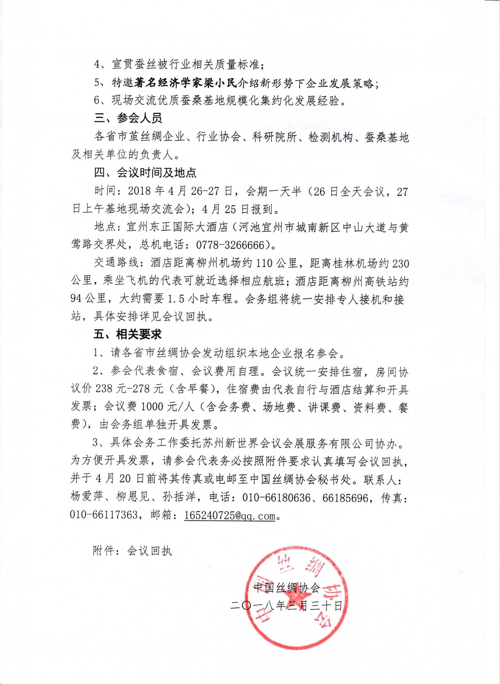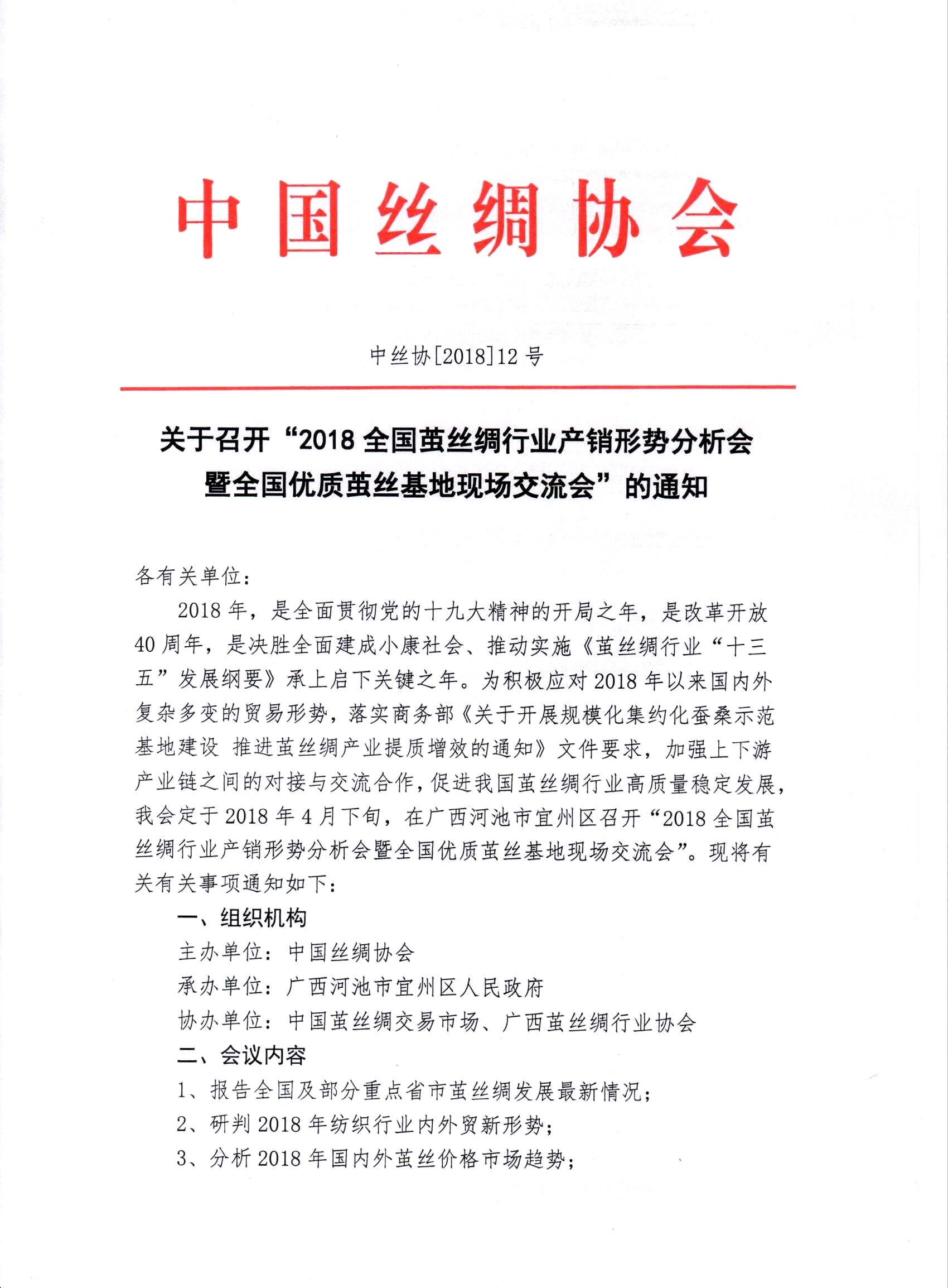 中國(guó)絲綢協(xié)會(huì)關(guān)于召開“2018全國(guó)繭絲綢行業(yè)產(chǎn)銷形勢(shì)分析會(huì)暨全國(guó)優(yōu)質(zhì)繭絲基地現(xiàn)場(chǎng)交流會(huì)”的通知