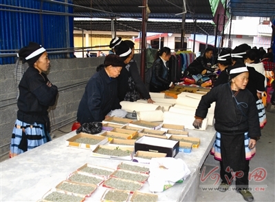 進入3月以來,在廣西南丹縣里湖瑤族鄉(xiāng)的集市上,白褲瑤同胞正在銷售一盒盒獨特的蠶寶寶,十分引人注目。