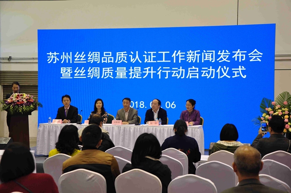 在“絲綢蘇州2018”展會(huì)期間,4月6日下午,蘇州市文廣新局、蘇州市質(zhì)監(jiān)局、國(guó)家絲綢及服裝產(chǎn)品質(zhì)量監(jiān)督檢驗(yàn)中心、中紡標(biāo)檢驗(yàn)認(rèn)證股份有限公司和蘇州絲綢行業(yè)協(xié)會(huì)聯(lián)手舉行蘇州絲綢品質(zhì)認(rèn)證工作新聞發(fā)布暨絲綢質(zhì)量提升行動(dòng)啟動(dòng)儀式。蘇州市文廣新局副局長(zhǎng)劉志勇、蘇州市質(zhì)監(jiān)局副局長(zhǎng)王燕、蘇州絲綢行業(yè)協(xié)會(huì)會(huì)長(zhǎng)楊偉、國(guó)家絲綢及服裝產(chǎn)品質(zhì)量監(jiān)督檢驗(yàn)中心主任周小進(jìn)、中紡標(biāo)檢驗(yàn)認(rèn)證股份有限公司總經(jīng)理馬詠梅、江蘇省絲綢協(xié)會(huì)秘書(shū)長(zhǎng)李鑫、市文廣新局產(chǎn)業(yè)處王斌主任、蘇州絲綢行業(yè)協(xié)會(huì)常務(wù)副會(huì)長(zhǎng)李民中等參加啟動(dòng)儀式。