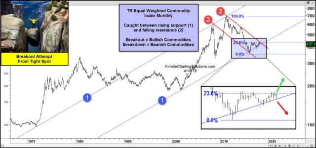 Chris Kimble指出,如今大宗商品指數(shù)上方的壓力位和下方的支撐位已日益狹窄,未來一段時間很可能將迎來關(guān)鍵的方向抉擇。由于該指數(shù)與商品市場各類資產(chǎn)(原油,金屬和農(nóng)產(chǎn)品(000061))間的關(guān)聯(lián)性極為緊密,因此無疑值得投資者密切留意。