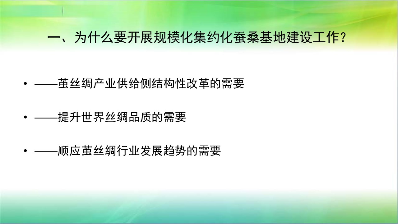 許多企業(yè)家朋友可能知道,去年10月份,國(guó)家繭絲辦在江蘇海安召開(kāi)了全國(guó)繭絲綢工作會(huì)議。會(huì)上,國(guó)家繭絲辦主任陳國(guó)凱同志作了重要講話(huà),并對(duì)規(guī)?;s化蠶桑基地工作作了動(dòng)員部署,深入闡明了開(kāi)展此項(xiàng)工作的重要意義、總體安排以及工作要求。此后,我們又作了大量調(diào)研、征求了有關(guān)部門(mén)、省市及企業(yè)的意見(jiàn),12月底,以商務(wù)部函的形式印發(fā)了《關(guān)于開(kāi)展規(guī)?;s化蠶桑示范基地建設(shè) 推進(jìn)繭絲綢產(chǎn)業(yè)提質(zhì)增效的通知》。通知印發(fā)以來(lái),我們與各省繭絲綢主管部門(mén)密切聯(lián)系,指導(dǎo)各地開(kāi)展規(guī)模化集約化蠶?;毓ぷ鳌母魇》答亖?lái)看,此項(xiàng)工作得到了繭絲綢企業(yè)的廣泛支持和熱烈響應(yīng),絕大多數(shù)省份已經(jīng)擬定了基地建設(shè)的實(shí)施方案,并匯總報(bào)到國(guó)家繭絲辦。但是,也有部分省份、部分企業(yè)對(duì)此項(xiàng)工作的開(kāi)展有一些疑問(wèn)。根據(jù)領(lǐng)導(dǎo)指示,我借參加本次大會(huì)的機(jī)會(huì),對(duì)大家關(guān)心的一些問(wèn)題作個(gè)介紹。為方便理解,接下來(lái)將以答問(wèn)的形式進(jìn)行。