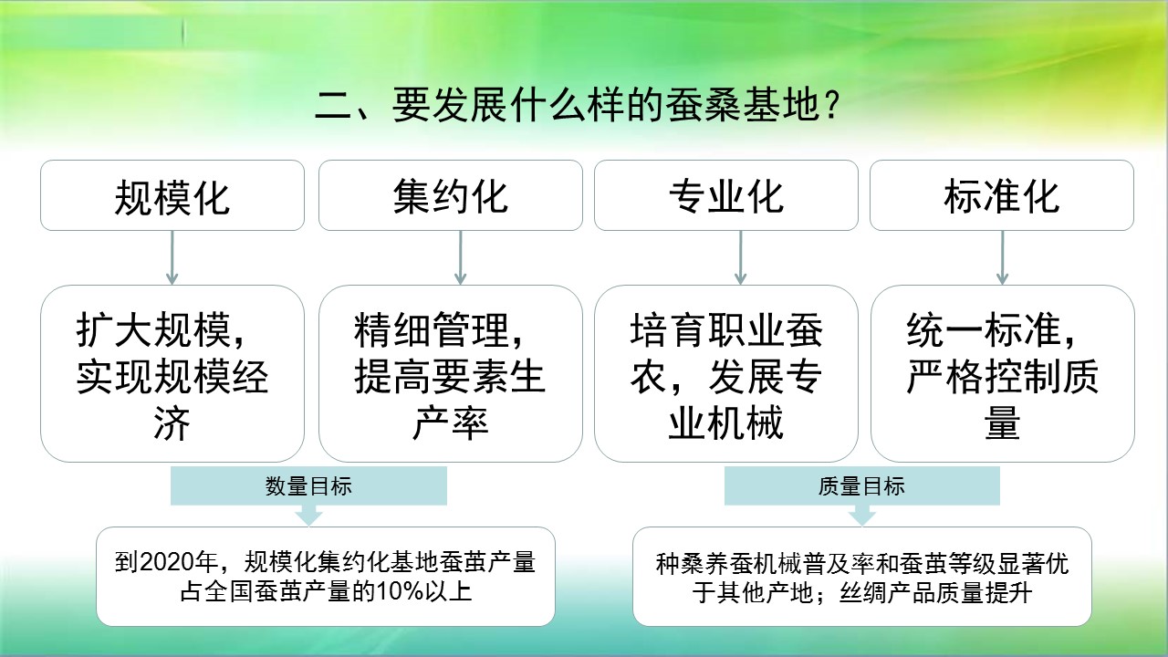 二、我們要發(fā)展什么樣的蠶桑基地?我們總結(jié)了四點(diǎn):規(guī)?;⒓s化、專(zhuān)業(yè)化、標(biāo)準(zhǔn)化。首先是規(guī)?;?,這是與傳統(tǒng)一家一戶(hù)分散種養(yǎng)最鮮明的區(qū)別,也是新型種養(yǎng)方式的最本質(zhì)特征。只有實(shí)現(xiàn)蠶桑的適度規(guī)模經(jīng)營(yíng),獲取規(guī)模效益,才能適應(yīng)新形勢(shì)下繭絲綢產(chǎn)業(yè)競(jìng)爭(zhēng)的需要,才能應(yīng)對(duì)下游市場(chǎng)的風(fēng)云變幻,才能為集約、專(zhuān)業(yè)、標(biāo)準(zhǔn)化經(jīng)營(yíng)奠定良好基礎(chǔ)。第二是集約化。也就是通過(guò)精細(xì)管理,充分利用各種資源,特別是開(kāi)展綜合利用,提高單位面積的產(chǎn)出水平,提高全要素生產(chǎn)率。簡(jiǎn)單來(lái)說(shuō),就是改變粗放生產(chǎn)方式,大力提高每畝桑園的收益、提高單個(gè)勞動(dòng)力的產(chǎn)出。第三是專(zhuān)業(yè)化。就是細(xì)化分工,積累技術(shù),培育職業(yè)蠶農(nóng)、專(zhuān)業(yè)大戶(hù),發(fā)展專(zhuān)業(yè)化機(jī)械、器具、設(shè)備,降低生產(chǎn)成本,提高勞動(dòng)生產(chǎn)率。四是標(biāo)準(zhǔn)化。在規(guī)?;s化的基礎(chǔ)上,逐步實(shí)現(xiàn)栽桑、養(yǎng)蠶、采繭等全生產(chǎn)過(guò)程的標(biāo)準(zhǔn)化,實(shí)現(xiàn)小范圍產(chǎn)品品質(zhì)的統(tǒng)一,進(jìn)而實(shí)現(xiàn)更大范圍內(nèi)的標(biāo)準(zhǔn)化。這“四化”之間是相輔相成、互相促進(jìn)的關(guān)系,例如,規(guī)?;降奶岣弑厝粫?huì)帶動(dòng)專(zhuān)業(yè)化、標(biāo)準(zhǔn)化的提升,而專(zhuān)業(yè)化、標(biāo)準(zhǔn)化的提升又有利于提高集約化水平,實(shí)現(xiàn)更高質(zhì)量的發(fā)展??梢哉f(shuō),這“四化”勾勒出了我們要發(fā)展的蠶?;氐幕咎卣鳎覀兘o它起名叫“規(guī)模化集約化蠶?;亍保鋵?shí)它也可以叫“優(yōu)質(zhì)蠶?;亍被蛘摺案咂焚|(zhì)蠶?;亍?,本質(zhì)是一樣的。