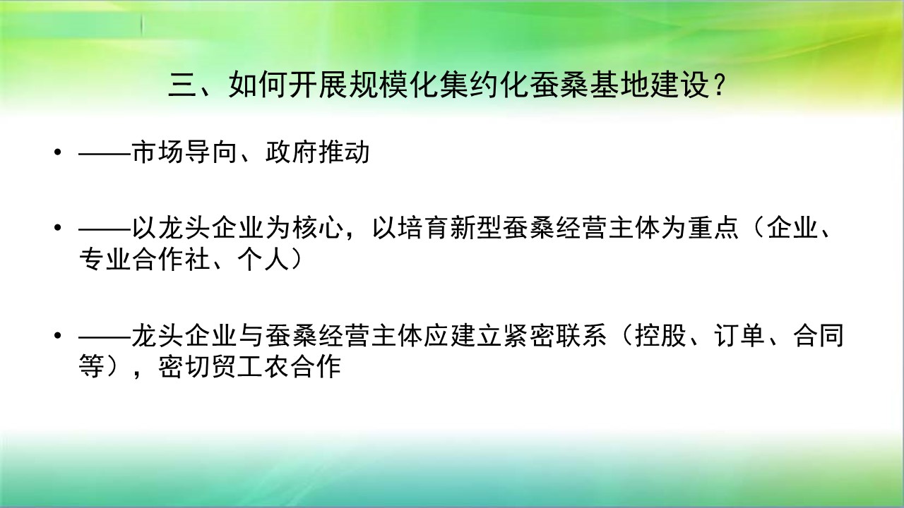 三、如何開(kāi)展規(guī)模化集約化蠶?;亟ㄔO(shè)?規(guī)模化基地建設(shè),首先是企業(yè)的自發(fā)行為。沒(méi)有企業(yè)、農(nóng)民的自愿參與,政府做出再大的努力也是無(wú)濟(jì)于事。因此我們提出,這項(xiàng)工作最大的原則就是“市場(chǎng)導(dǎo)向、政府推動(dòng)”,政府(繭絲辦)發(fā)揮政策支持、宣傳發(fā)動(dòng)和組織協(xié)調(diào)作用,為廣大企業(yè)創(chuàng)造良好的發(fā)展環(huán)境。我們鼓勵(lì)龍頭企業(yè)發(fā)揮核心帶動(dòng)作用,大力培育新型蠶桑經(jīng)營(yíng)主體;新型蠶桑經(jīng)營(yíng)主體可以是企業(yè),可以是蠶農(nóng)專(zhuān)業(yè)合作社,也可以是個(gè)人或者大戶(hù)。實(shí)施的關(guān)鍵在于龍頭企業(yè)與蠶桑經(jīng)營(yíng)主體應(yīng)建立緊密的聯(lián)系,可以是控股、可以是訂單關(guān)系、也可以是全方位的合作合同。通過(guò)這些方式,最終實(shí)現(xiàn)貿(mào)工農(nóng)協(xié)調(diào)發(fā)展。