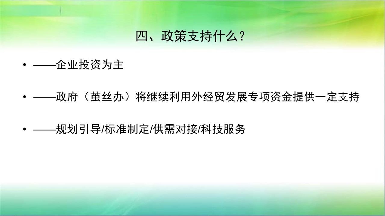 四、政策支持什么?剛剛我們提到,這項(xiàng)工作的原則是“市場(chǎng)導(dǎo)向、政府推動(dòng)”,因此,主要的工作還需要龍頭企業(yè)完成。在企業(yè)自愿參與的基礎(chǔ)上,2018-2020年,繭絲綢主管部門(mén)將繼續(xù)利用中央外經(jīng)貿(mào)發(fā)展專(zhuān)項(xiàng)資金提供一定支持,有條件的省份還將協(xié)調(diào)其他資金提供支持。除資金支持外,主管部門(mén)還將相應(yīng)地開(kāi)展一系列工作。首先是規(guī)劃引導(dǎo),各地將制定本地的規(guī)模化基地發(fā)展規(guī)劃,明確區(qū)域布局,提出發(fā)展重點(diǎn);其次是標(biāo)準(zhǔn)制定,各地將制定本地的基地建設(shè)標(biāo)準(zhǔn),同時(shí)推進(jìn)地方標(biāo)準(zhǔn)的制修訂進(jìn)程,為基地建設(shè)提供規(guī)范;再次是推進(jìn)供需對(duì)接,發(fā)揮橋梁紐帶作用,為企業(yè)與企業(yè)、企業(yè)與地方政府開(kāi)展合作提供協(xié)助;還有就是科技服務(wù),通過(guò)政府購(gòu)買(mǎi)服務(wù)方式聘請(qǐng)行業(yè)專(zhuān)家為各地基地建設(shè)工作提供技術(shù)支撐,等等。在此過(guò)程中,我們也將和中國(guó)絲綢協(xié)會(huì)、中國(guó)蠶學(xué)會(huì)等行業(yè)組織密切合作,凝聚行業(yè)各方合力,共同推動(dòng)這項(xiàng)工作的進(jìn)展。
