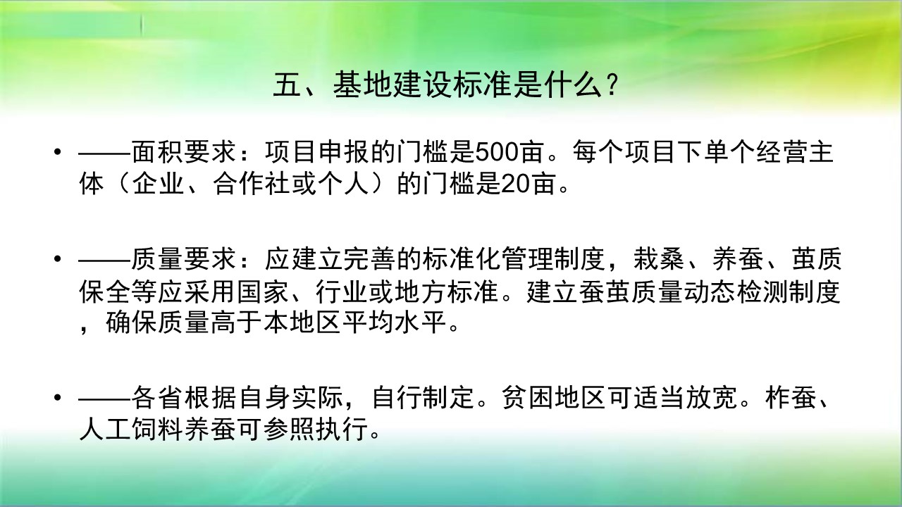 五、基地建設(shè)標(biāo)準(zhǔn)是什么?這是很多人關(guān)心的一個(gè)問(wèn)題。原則上說(shuō),只要體現(xiàn)規(guī)?;?、集約化、專(zhuān)業(yè)化、標(biāo)準(zhǔn)化特征的基地都是規(guī)?;亍5菫榱藵M(mǎn)足資金使用的要求,我們本著盡量簡(jiǎn)化的原則提出了兩條基本標(biāo)準(zhǔn),一是面積標(biāo)準(zhǔn),企業(yè)申報(bào)的項(xiàng)目至少應(yīng)覆蓋500畝桑園,這些桑園要么由申報(bào)企業(yè)直接經(jīng)營(yíng),要么申報(bào)企業(yè)與經(jīng)營(yíng)主體簽訂了5年以上(含)的蠶桑生產(chǎn)、技術(shù)服務(wù)和蠶繭銷(xiāo)售合同;經(jīng)營(yíng)主體可以是多個(gè),但每個(gè)經(jīng)營(yíng)主體管理的面積要在20畝以上;二是質(zhì)量標(biāo)準(zhǔn),應(yīng)建立完善的標(biāo)準(zhǔn)化管理制度,栽桑、養(yǎng)蠶、繭質(zhì)保全等各環(huán)節(jié)均應(yīng)采用國(guó)家、行業(yè)或地方標(biāo)準(zhǔn),要建立蠶繭質(zhì)量動(dòng)態(tài)檢測(cè)制度確保質(zhì)量高于本地區(qū)平均水平。由于各地土地、氣候、發(fā)展水平等情況不一致,我們?cè)试S各省根據(jù)自身實(shí)際,自行制定具體的面積和質(zhì)量標(biāo)準(zhǔn),但是除貧困地區(qū)外,均不應(yīng)低于國(guó)家的標(biāo)準(zhǔn)水平。柞蠶、人工飼料養(yǎng)蠶可以參照?qǐng)?zhí)行,由各省制定細(xì)則。