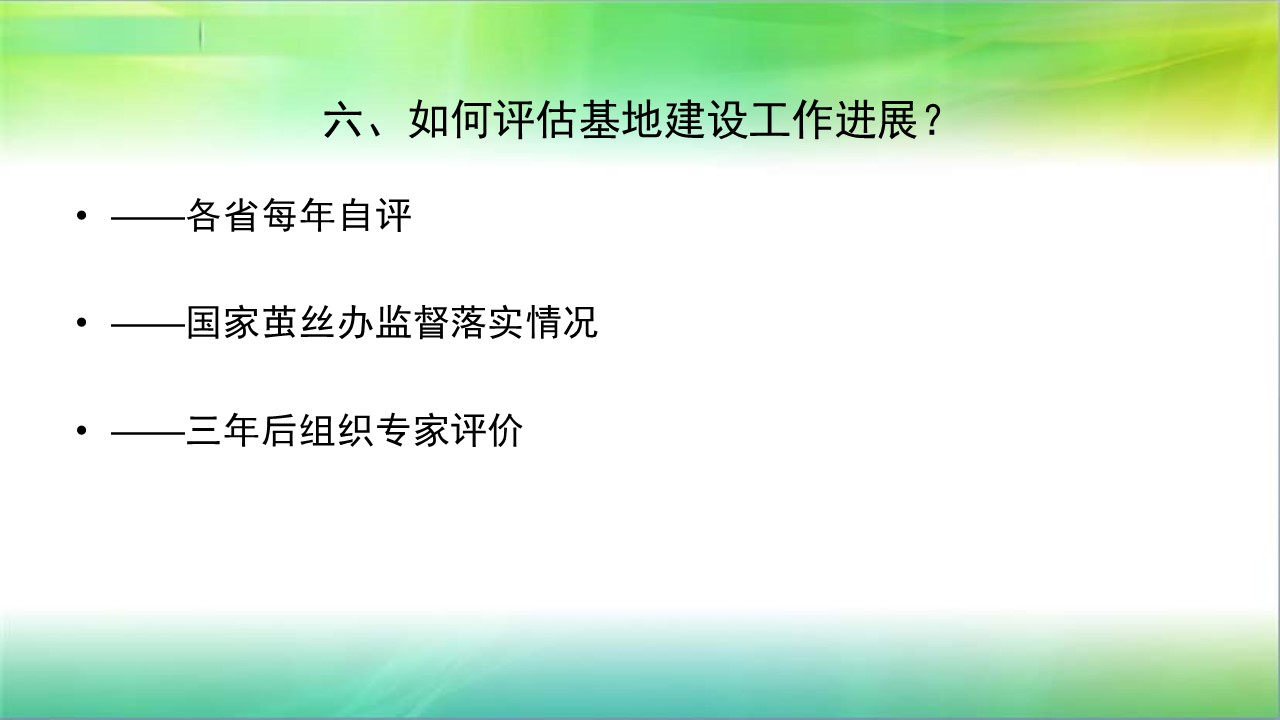 六、如何評(píng)估基地建設(shè)工作進(jìn)展?我們請(qǐng)各省制定了3年發(fā)展的進(jìn)度目標(biāo),3年間每年年末請(qǐng)各省進(jìn)行自評(píng),同時(shí),國(guó)家繭絲辦將不定期開(kāi)展督察,監(jiān)督建設(shè)工作的落實(shí)情況。我們正在與中國(guó)纖維檢驗(yàn)局溝通,研究每年對(duì)基地的蠶繭質(zhì)量進(jìn)行檢查,并將檢查結(jié)果在一定范圍內(nèi)公布,方便對(duì)比、監(jiān)督。3年后也就是2020年結(jié)束后,我們將組織專(zhuān)家進(jìn)行評(píng)價(jià),對(duì)照各省制定的面積及產(chǎn)量目標(biāo),總結(jié)基地建設(shè)成效。
