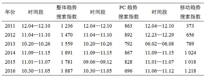 表1 搜索整體、PC端及移動(dòng)端搜索指數(shù)周平均值最高時(shí)間段統(tǒng)計(jì)