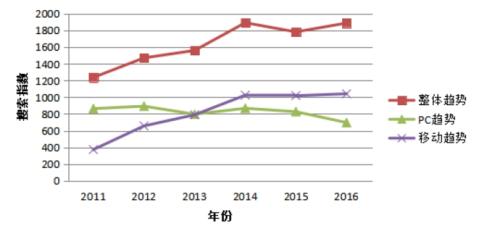 圖1 2011—2016年搜索整體、PC端及移動(dòng)端搜索指數(shù)周平均最高值趨勢(shì)圖