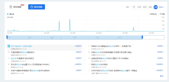 輿情洞察項(xiàng)目包括新聞監(jiān)測(cè)和百度知道。新聞監(jiān)測(cè)數(shù)據(jù)顯示媒體在互聯(lián)網(wǎng)上對(duì)特定關(guān)鍵詞的關(guān)注及報(bào)道程度及持續(xù)變化情況。從百度新聞搜索“蠶絲被”共找到相關(guān)新聞約7 040篇,2011-01-05 至 2017-01-22這個(gè)時(shí)間段內(nèi)“假貨蠶絲被”占據(jù)了主要的新聞?lì)^條(圖4),如“百元‘蠶絲被’八成是山寨貨”“網(wǎng)購(gòu)蠶絲被充斥假貨”“北京市場(chǎng)近半蠶絲被不達(dá)標(biāo)寶萊家紡蠶絲被竟無(wú)一根蠶絲”等。