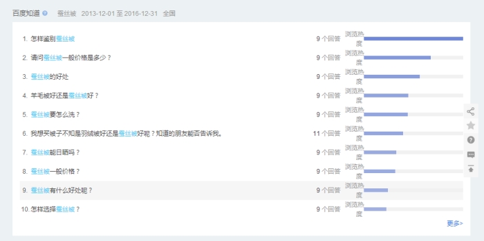 百度知道數(shù)據(jù)反映該關(guān)鍵詞在百度知道上的相關(guān)提問(wèn)內(nèi)容。在百度知道上搜索“蠶絲被”共有441 031條結(jié)果,而2013-12-01至2016-12-31排名前三位的提問(wèn)為“怎樣鑒別蠶絲被”“請(qǐng)問(wèn)蠶絲被一般價(jià)格是多少?”“蠶絲被的好處”(圖5)。