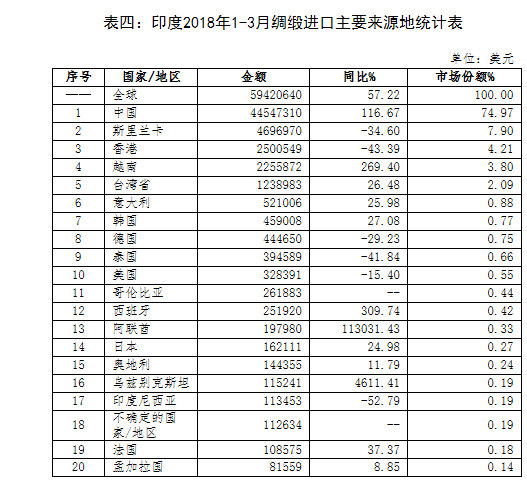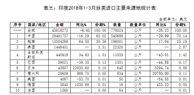 從印度進(jìn)口來看,根據(jù)中國(guó)紡織品進(jìn)出口商會(huì)的數(shù)據(jù),今年1-3月,印度絲綢商品進(jìn)口額為1.35億美元,同比增長(zhǎng)31.09%;出口額為7.95億美元,同比下降22.76%。剔除匯率波動(dòng)的因素,印度絲綢的出口同樣不是很樂觀。如果這部分貨值不能在印度國(guó)內(nèi)有效消化,會(huì)影響3月后中國(guó)對(duì)印度的出口,這已經(jīng)在這幾個(gè)月的出口情況大致已經(jīng)反映出來。不過要更加關(guān)心的是目前后期的形勢(shì)變化。