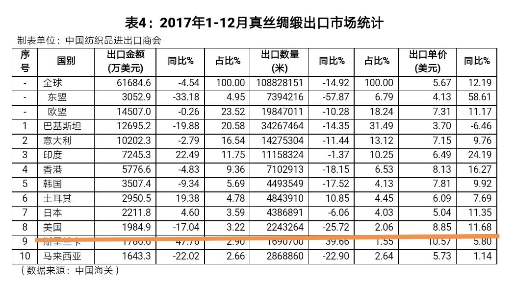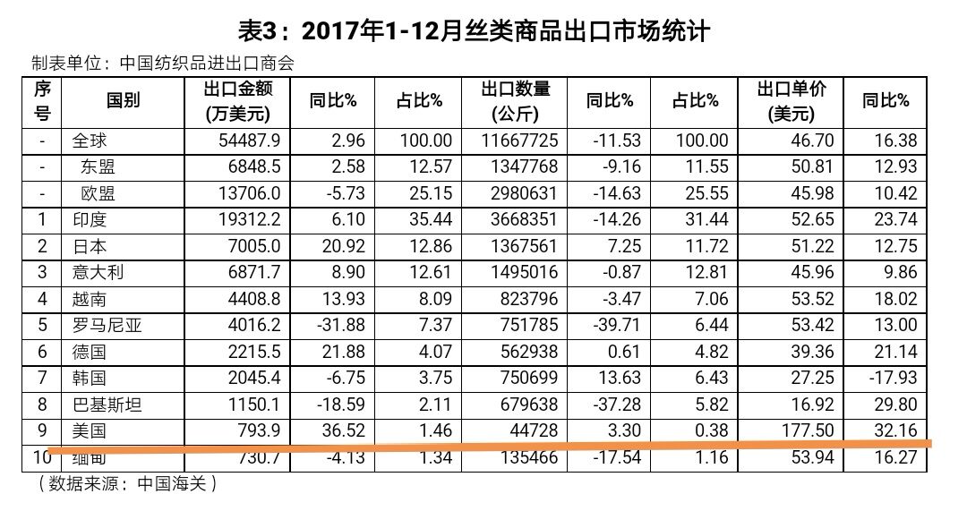 以下是中國2017年1-12月絲綢商品進出口數(shù)據(jù)統(tǒng)計。絲綢商品出口分為絲類,綢類和絲綢制成品三大類,對美國出口量較大的絲巾,領帶,絲綢針織和梭織服裝等絲綢制成品未列入清單。