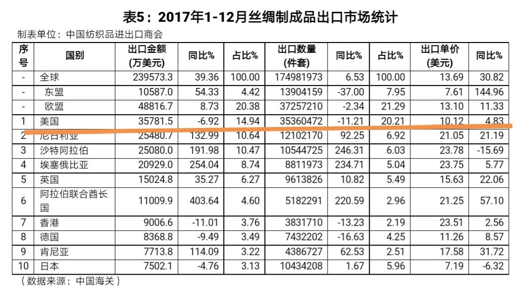 絲綢制成品:對美國出口量占全年出口總量的20.21(不在此列)。