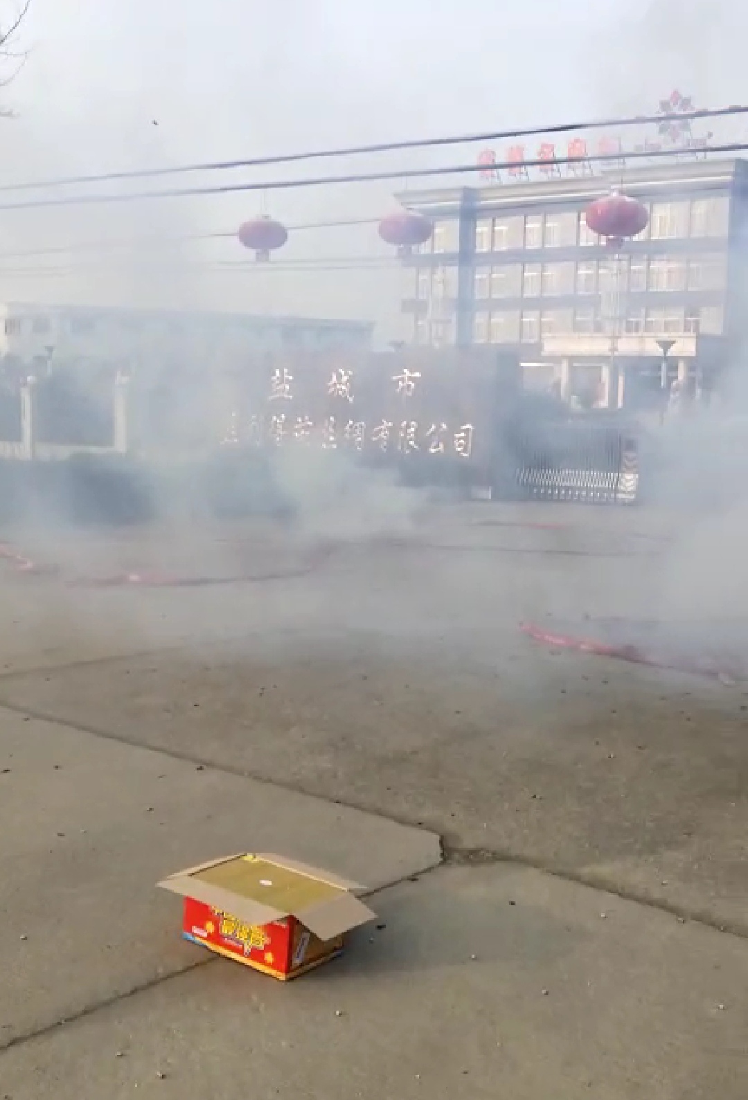 江蘇鹽城,絲得利繭絲綢公司今日開工,廠門口鞭炮震天響一片好兆頭。