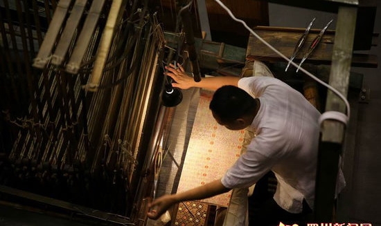 蜀錦其價(jià)如金主要體現(xiàn)在制作工藝上。要完成一件作品,從程序上說,主要需經(jīng)歷初稿設(shè)計(jì)、定稿、點(diǎn)意匠、挑花結(jié)本、裝機(jī)、織造等十多個(gè)工序,每一道程序又涉及到五、六十道獨(dú)特的技藝。一個(gè)人無法完成一個(gè)蜀錦產(chǎn)品,從小樣設(shè)計(jì)到上機(jī)織造,一般需要七、八個(gè)人,耗時(shí)更是少則數(shù)月,多則數(shù)年。