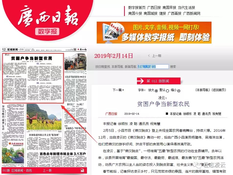 2月5日,小品節(jié)目《懶漢脫貧》登上央視全國農(nóng)民春晚舞臺,持續(xù)火爆。2016年12月,出自凌云的《懶漢脫貧》轟動一時,后由廣西小品演員楊建偉、吳海洋出演,他們把懶漢的游手好閑、扶貧干部的良苦用心演繹得淋漓盡致。