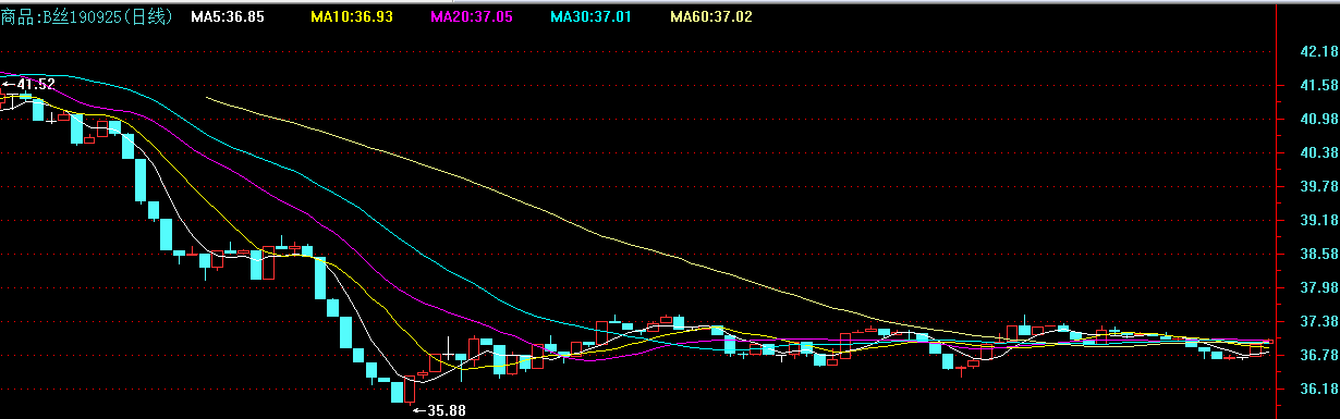 今日(周二)中國繭絲綢交易市場生絲指數(shù)報收于3686.88點基本與上一交易日持平。B絲(3A級生絲):190325(合同約定的交收日)上漲300元報36.66萬元,190925上漲600元報37.05萬元。干繭盤面略有下跌向現(xiàn)貨價靠攏。