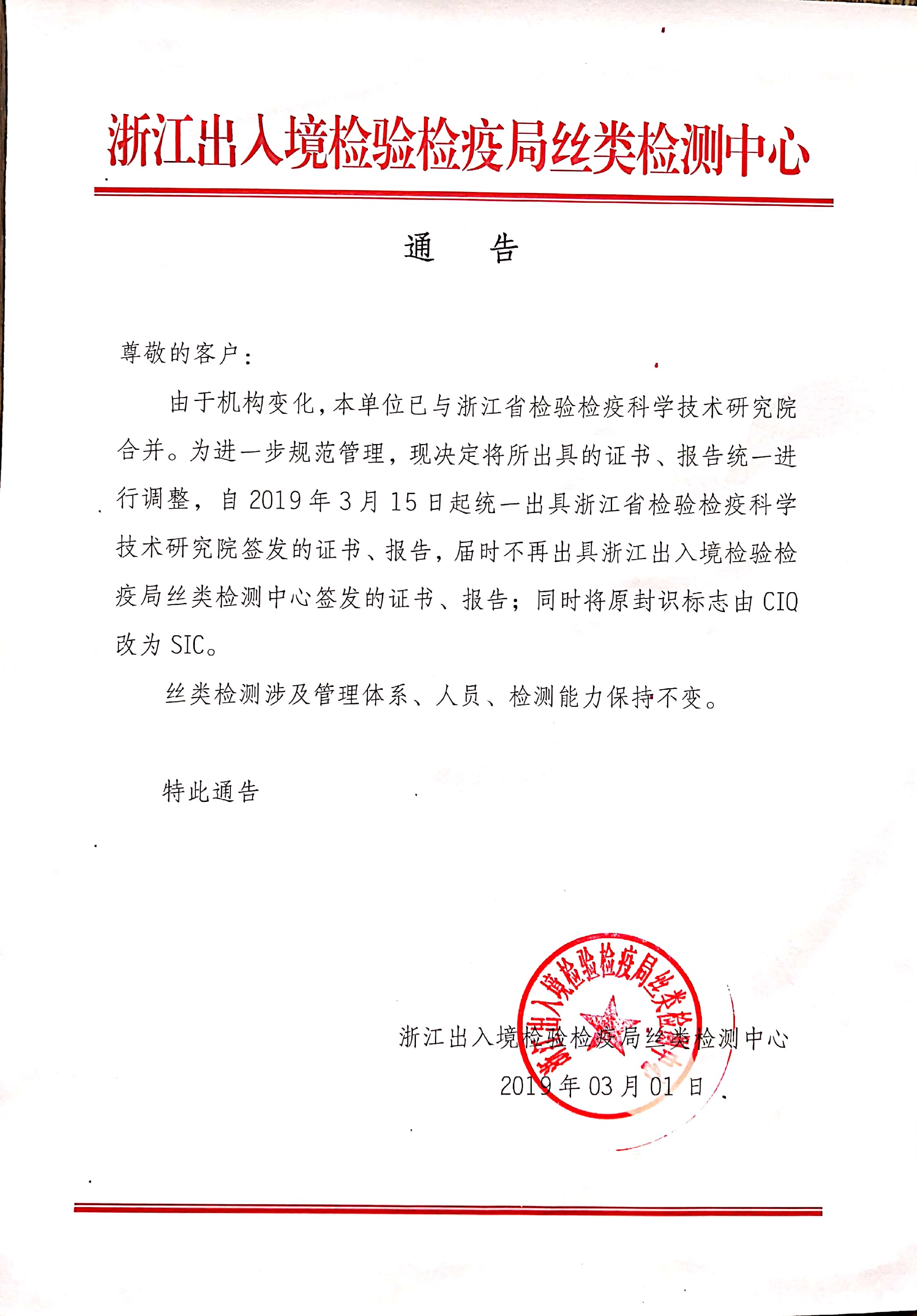 Due to institutional changing, we, Silk Inspection Center of Zhejiang Entry-Exit Inspection & Quarantine Bureau, have been merged with Zhejiang Academy of Science and Technology for Inspection and Quarantine. We are here to notice you that the certificates and reports will be issued by Zhejiang Academy of Science and Technology for Inspection and Quarantine since 15th March, 2019. Meanwhile the certificates and reports will no longer be issued by the Silk Inspection Center of Zhejiang Inspection and Quarantine. And the seals on the packages will be changed to SIC which are instead of CIQ. Others including testing methods, testing capabilities, etc, will be remained.